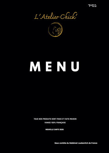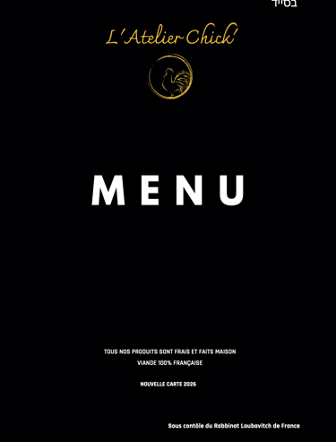 L’Atelier Chick est bien plus qu’un simple restaurant : c’est une invitation à redécouvrir le poulet sous une nouvelle dimension. Nous sommes fiers d’être les premiers à proposer du poulet braisé cacher en France, un plat savoureux aux saveurs uniques, sublimé par une cuisson lente et maîtrisée. Notre ambition est de marier tradition et modernité dans une ambiance élégante et chaleureuse. Chaque assiette est pensée pour offrir une expérience gustative inoubliable, en respectant les exigences strictes de la cacheroute.